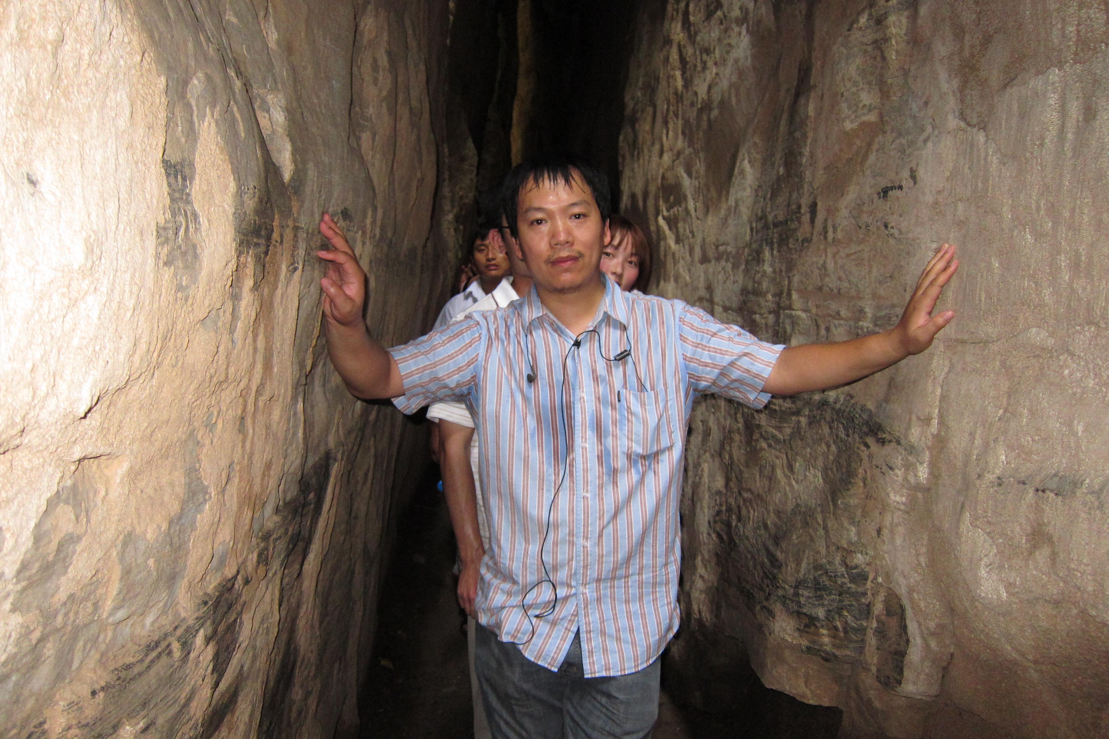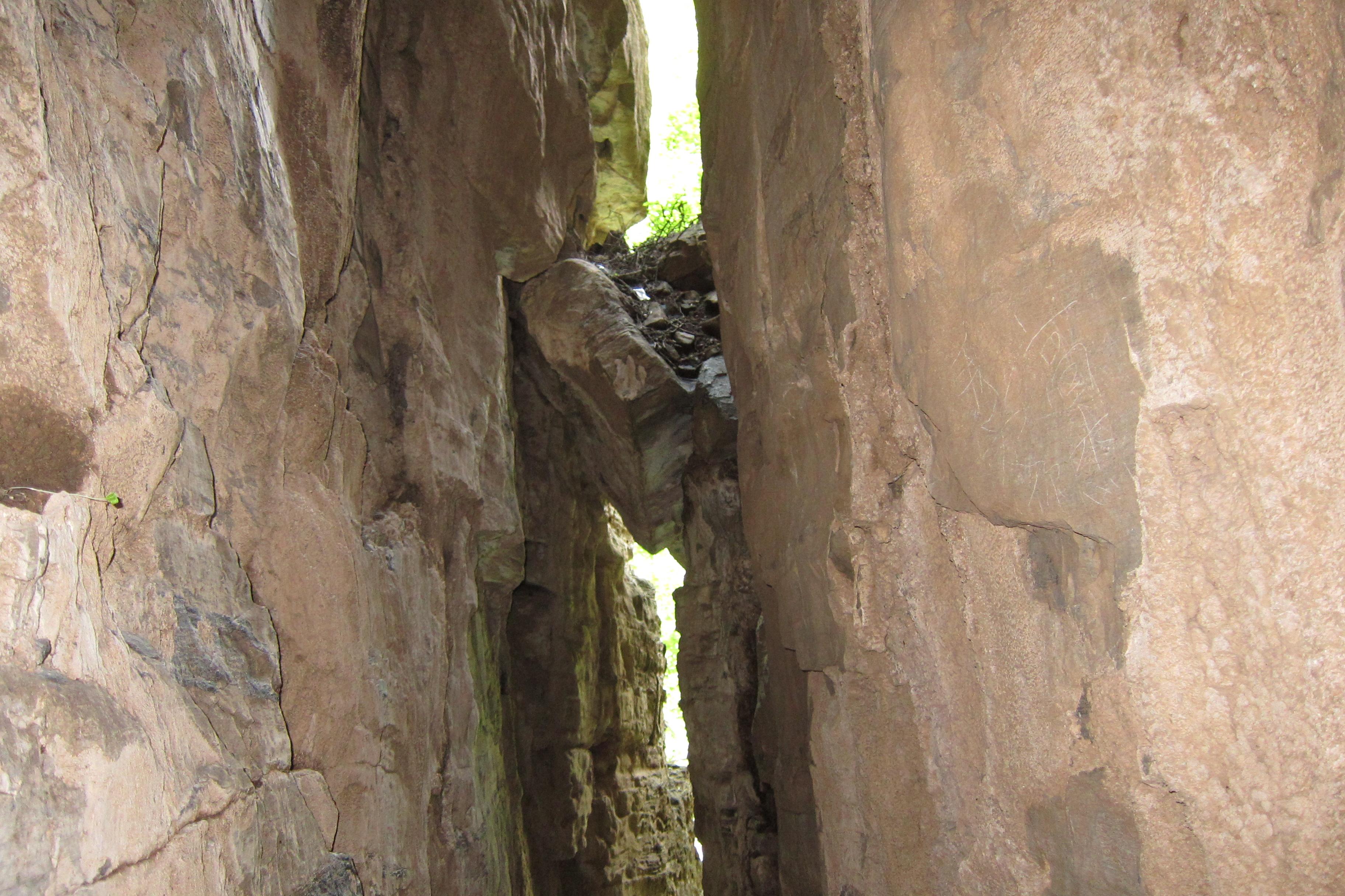 沿古河床北側(cè)山路拾級(jí)而上,步行登高,經(jīng)過(guò)坦克石,到達(dá)小孤山,再沿山腰羊腸小道上行幾百米,可見(jiàn)一幾乎直立的陡峭山坡,轉(zhuǎn)過(guò)一條溝走到近前,猛抬頭,只見(jiàn)巍然聳立的陡壁之中裂開(kāi)一條巨縫,兩壁巖石直立,如刀削斧砍,經(jīng)仔細(xì)測(cè)量巨縫長(zhǎng)達(dá)65米,高40余米,最窄處僅有60多厘米,一人通過(guò)兩壁擦肩。此刻洞外烈日當(dāng)頭、炙熱難耐,而鉆進(jìn)裂隙頓覺(jué)涼爽宜人,仔細(xì)觀察兩側(cè)山巖奇異,巖石表面有輕微溶蝕,略有凹凸不平,在一些細(xì)小縫隙中也有類似石鐘乳的沉淀形態(tài)。因?yàn)橛晁臐B入和溶蝕,在兩壁巖石面上出現(xiàn)斑駁的沉積和侵蝕痕跡,如壁畫(huà),似崖刻,有的形如飛禽走獸,有的如樹(shù)木花草,也有的似云霞如波濤,千姿百態(tài)美不勝收.因?yàn)榱严逗苷疑睿瑑?nèi)部光線較暗,抬頭仰望只見(jiàn)一線藍(lán)天,令人驚心動(dòng)魄,人們擠在這深邃的地縫之中。連說(shuō)話都不敢大聲,生怕這裂縫稍有閉合,實(shí)在是太驚險(xiǎn)了,身在縫中有點(diǎn)像壓在大山下的感覺(jué),不僅是刺激,而且令人生畏。這實(shí)在可稱的上是一驚險(xiǎn)奇觀。