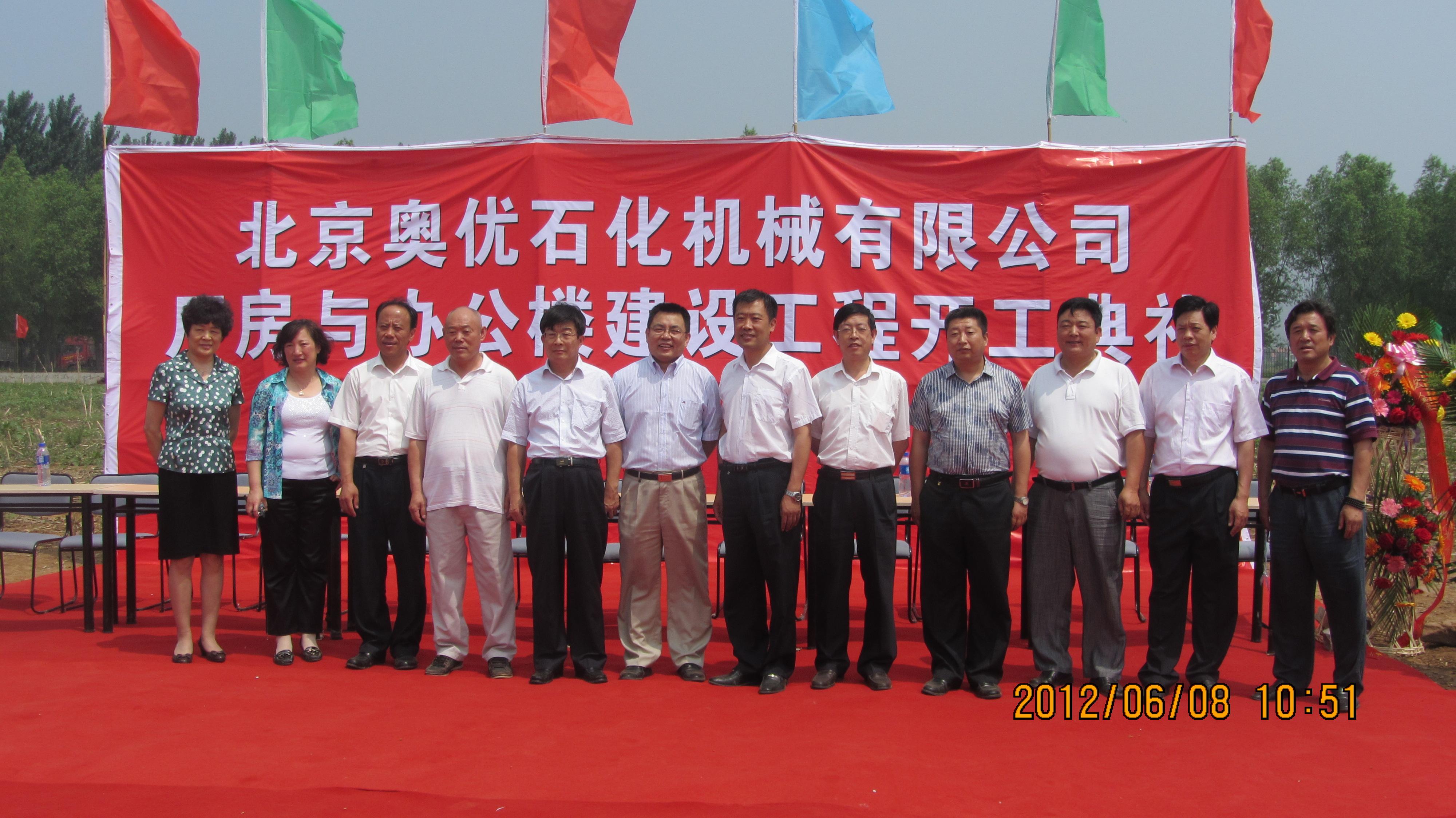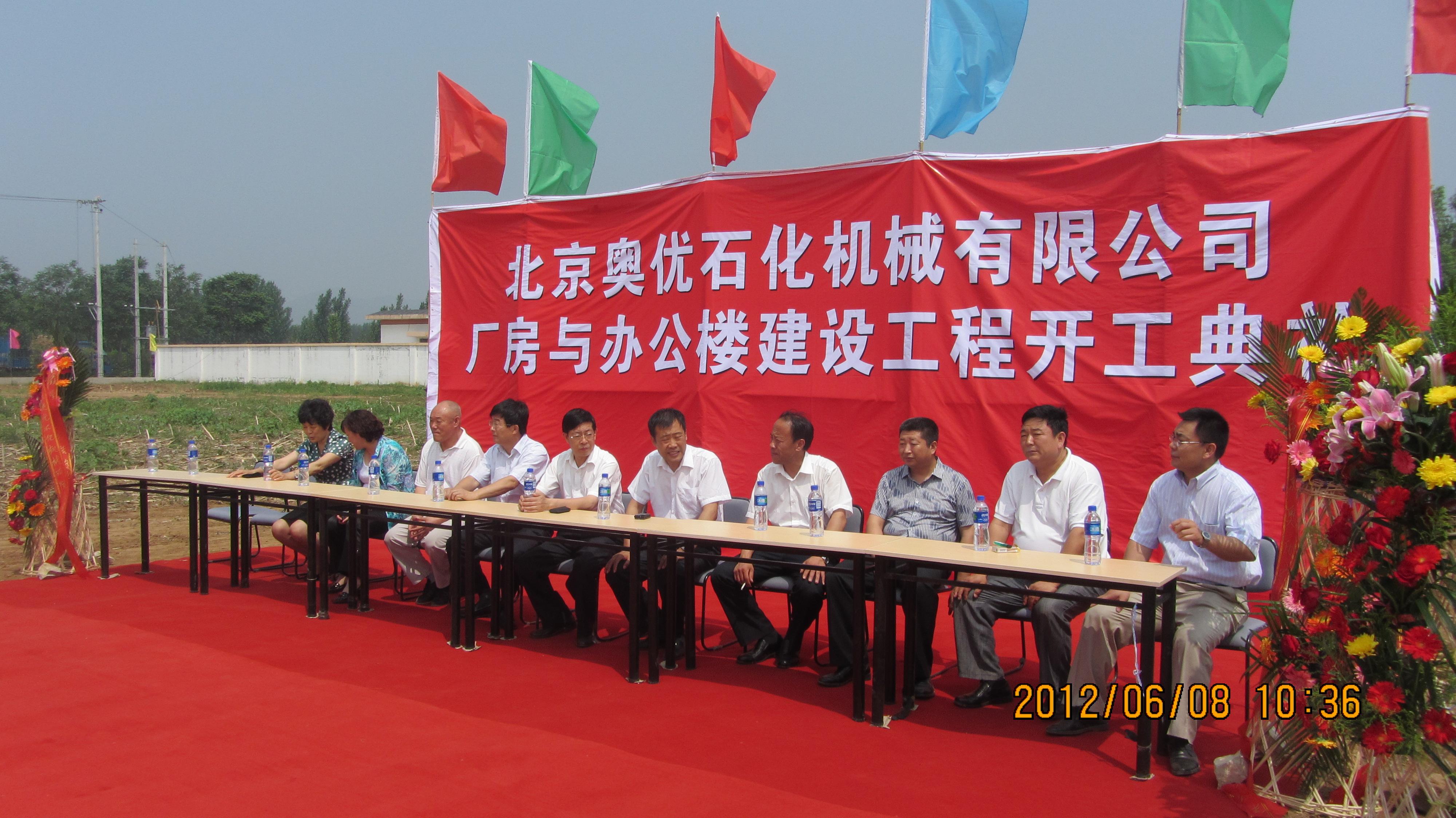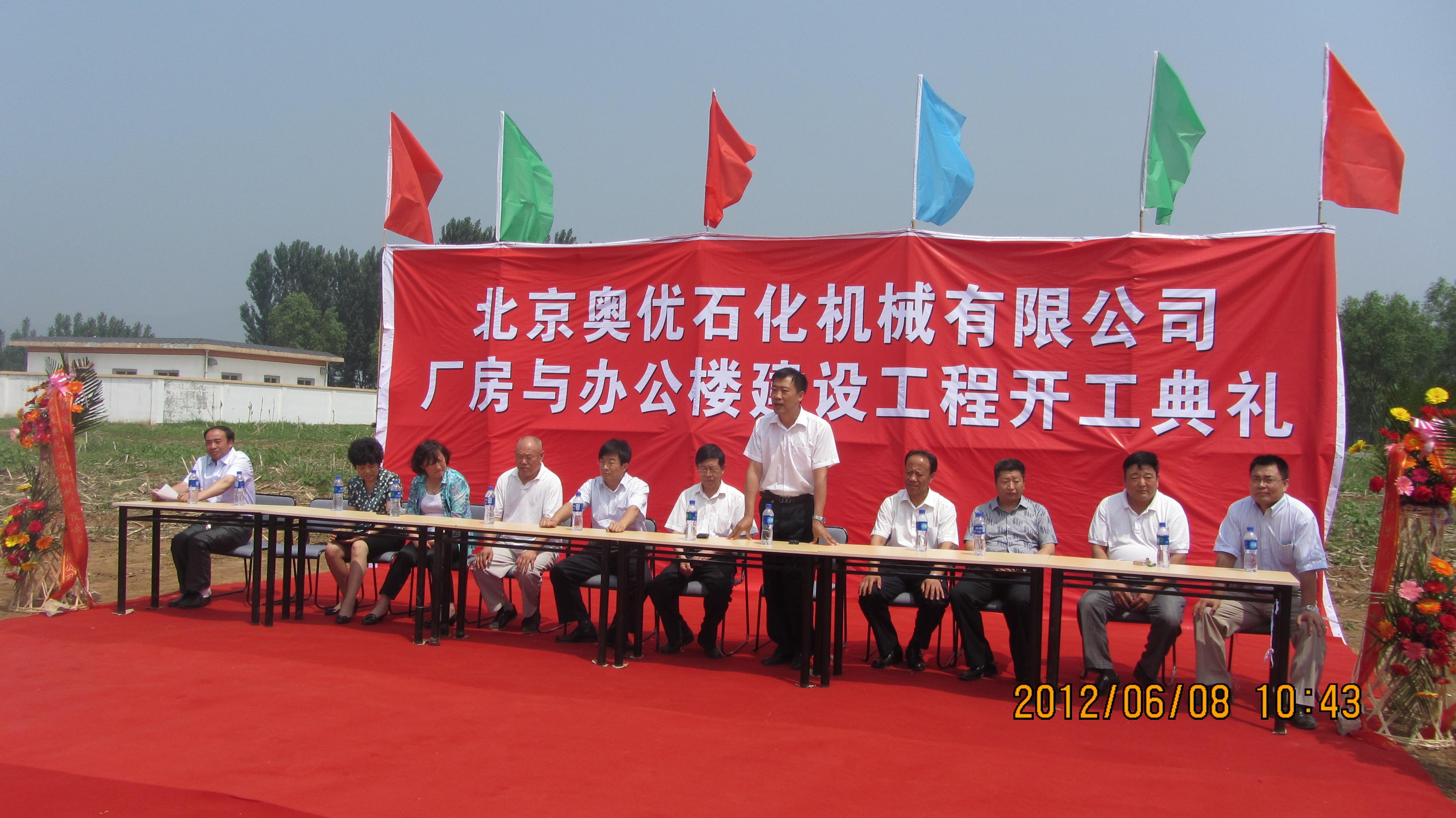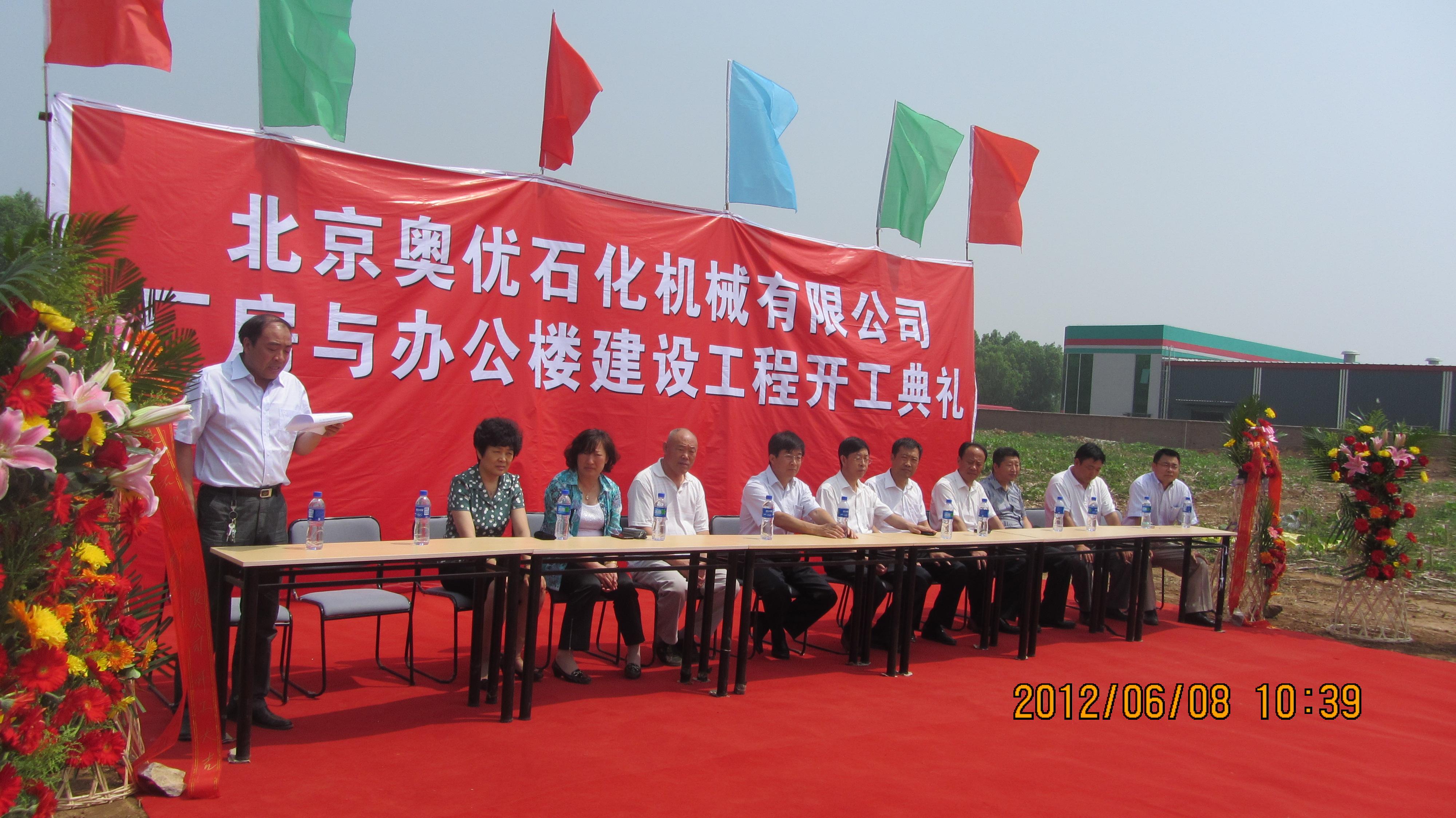 2012年6月8日上午,北京奧優石化機械有限公司新廠房和辦公樓建設工程開工奠基儀式在北京市平谷區興谷開發區舉行。北京奧優石化機械有限公司董事長武戰略、廠長張鳳忠、開發區陳艷明書記、張術明副主任、陳黎明主席、趙麗明副主任、張秋林副主任、胡國興副主任、平谷區招商局張慶江副局長等相關領導出席了奠基儀式,儀式由北京奧優石化機械有限公司副總經理陳亮主持。