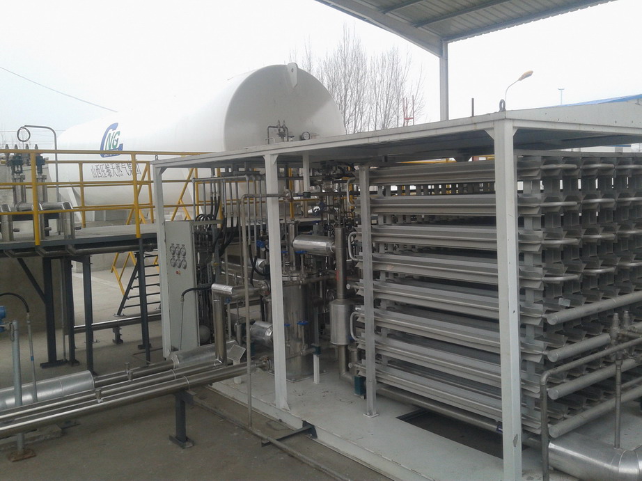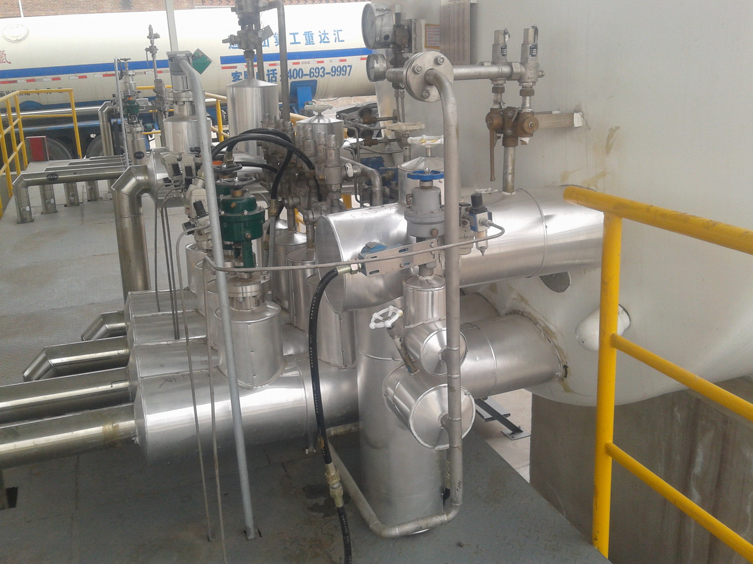 LNG加注裝置,是為汽車加注LNG而單獨開發的高度集成設備,該設備分為三大塊:儲液罐及工藝裝備撬、加液機、控制值班室。可方便的進行充罐和注液。該設備由卸車部分、增壓部分、儲液罐部分、潛液泵部分、售氣機部分、安全控制部分及值班集裝箱部分組成。